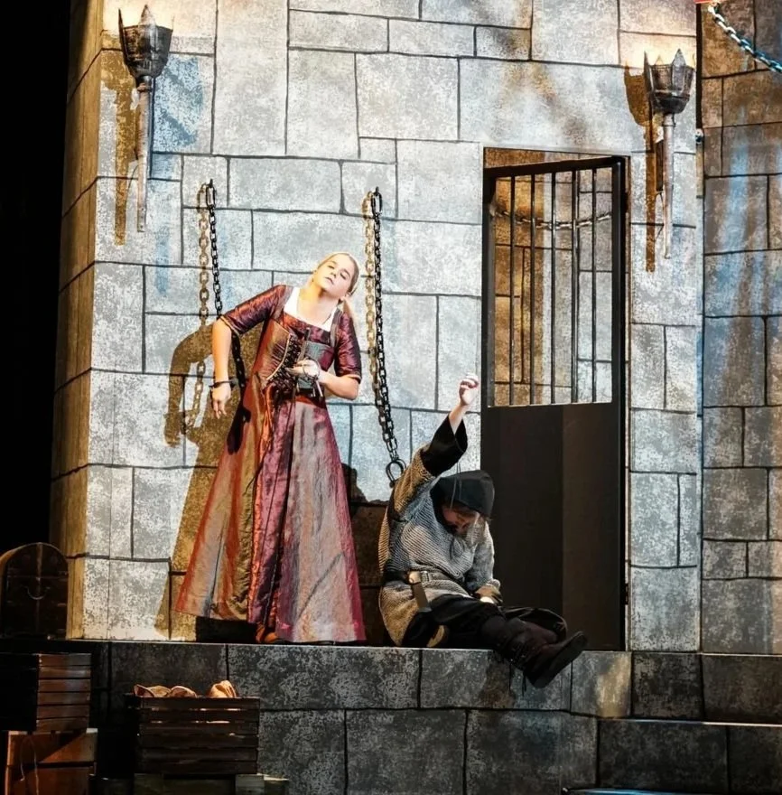 This play, a retelling of the story of Robin Hood where Maid Marian is simultaneously the famous criminal, is set in both Sherwood Forest and Prince John’s Castle. We wanted to be able to display both location on stage without having to move an abundance of set pieces each time a scene changed. In order to do this, we split the stage to represent the end of Prince John’s Castle and the edges of the forest. Robin Hood existed in the Medieval era, so we embraced with style with either lots of stone work and sharp edges (for the castle) or natural shapes and colors (for the forest). The play also includes many dynamic fight scenes so we wanted to play with levels in order to make these more complex and entertaining.